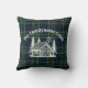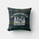 Bring cabin coziness to your sofa or bed with this custom throw pillow. Featuring a hand-drawn log cabin with pine trees and sunshine over classic green-and-blue tartan plaid, it’s a charming decorative piece for a rustic lodge, mountain getaway, or woodland home. Personalize with your family name for the perfect snuggle-worthy gift or stylish accent.