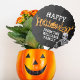 Cool custom annual family Halloween party balloon that features a creepy skeleton hanging over spooky orange and black text and an awesome Jack O Lantern. Customize this decor with your big bash information for all of your guests.
