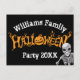 Cool custom annual family Halloween party invitation postcard that features a creepy skeleton hanging over spooky orange and black text and an awesome Jack O Lantern. Customize with your big bash information for all of your guests.