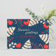 Send warm wishes this festive season with our personalized holiday card featuring a charming Scandinavian-inspired design. This cheerful card showcases red folk-art style birds, candy canes, and white Christmas trees set against a navy blue snowy background. The text reads “Season’s Greetings” with space below to add your family name or custom message for a truly personal touch.