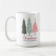 Enjoy this custom Christmas tree coffee mug with a family name. This design features three retro cartoon Christmas trees with bright stars on top in a winter vibe setting. The trees are dark & light green and pinkish mauve and adorned with ornaments and bulbs. "Christmas" is in a red vintage retro and stylish script typography with the custom family name in a classic green print that is easy to read. Use the Personalize function to customize it to your needs. This mug will make a great gift for family, friends, relatives and work colleagues and many others. Merry Christmas!