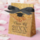 Custom faux gold image class of graduation party favor boxes. Elegant boxes for graduate students celebrating their grad year. Add your own high school name and year. Stylish typography template with tassel hat logo. Customizable background color and bow color. Bulk gift idea for him or her. Glamorous sparkly golden background print with glittery glimmers. 2025 and on.