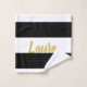 This black and white bath towel set has horizontal stripes. Personalize the text in faux gold script.