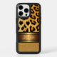 Beautiful contemporary leopard fur spots pattern and faux shiny gold leather. With a faux metallic gold and copper colored banner across to personalize or customize with a name, monogram, or initials of your choice. Beautiful, modern, and cool cover for the trend-savvy and art-loving hip trendsetter, artsy motif lover who wants to protect their phone from dust and dirt, wear and tear. This design is available in Apple iPhone 6, 7, 8, 10 or X, XR, XS, 11, 12, 13 Mini, 14, 15 Plus, and Pro Max cellphone cases. Show off your style, look fashionable trendy, and feel stylish with a unique design on a mobile device accessory of your choice.