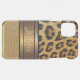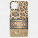 Beautiful contemporary leopard fur spots pattern and faux shiny gold leather. With a faux metallic gold and copper colored banner across to personalize or customize with a name, monogram, or initials of your choice. Beautiful, modern, and cool cover for the trend-savvy and art-loving hip trendsetter, artsy motif lover who wants to protect their phone from dust and dirt, wear and tear. This design is available in Apple iPhone 6, 7, 8, 10 or X, XR, XS, 11, 12, 13 Mini, 14, 15 Plus, and Pro Max cellphone cases. Show off your style, look fashionable trendy, and feel stylish with a unique design on a mobile device accessory of your choice.