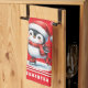 Create a personalized red Christmas kitchen towel with a festive design that features a cute ice skating penguin on a red background with elegant snowflakes. Use the template to type your name or a saying for the unique kitchen decor for the holiday season.