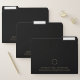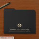 Custom file folders designed for law firms featuring a solid black background, company name and contact information in classic golden typography. The brushed gold legal-themed logo can be used as is or replaced with your firm's logo. Keep your documents organized and secure with these elegant custom file folders. A must-have tool for efficient document management.
