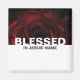 Custom Floral Red Rose BLESSED Magnet, with the word BLESSED in WHITE typography and IN JESUS' NAME in gray. All text is CUSTOMIZABLE, so you can create your own text, add your favorite Scripture reference or add your name. This inspirational Blessed magnet would also make a great gift for Christmas, Birthdays, Mother's Day, Father's Day, etc, or favor giveaway at your church services or conferences. Matching gifts available.