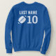 Stay warm and spirited with this royal blue sweatshirt featuring a white circular badge design with a customizable team name, helmet with player number, stars, and "Football" lettering. The cozy crew neck is perfect for cool fall game days, early morning practices, and cheering from the stands on chilly Friday nights. Customize with your player's team and number for a sideline essential that keeps you warm all season.