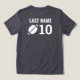 Design features a stylish round logo with football helmet, stars and stripes. Personalize with your player's football team name, jersey number, and last name. Includes a football accent on the back.
