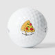 Custom golf balls with fun food icons including pizza, burger, and hot dog designs.