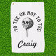 This golf towel brings humor and sophistication to your game with its clever, Shakespeare-inspired design. Featuring the witty quote, “To Tee, or Not to Tee,” accompanied by a skull-shaped golf ball on a tee, it playfully reimagines the iconic line from Hamlet in a golfer’s context. The black-and-white, simple illustration adds a classic and stylish touch to your golf bag, while the lightweight, absorbent fabric ensures it’s practical for keeping your clubs clean and dry. Personalization options allow you to add a name or initials, making it a great gift for any golfer who appreciates both jokes and literary flair. Whether for a birthday, tournament, or just a day on the course, this towel is sure to be a conversation starter.