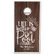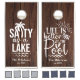 This playful outdoor game board set is perfect for lake and pool lovers alike. One board reads “Salty as a Lake” with a bold palm tree graphic, while the other says “Life is Better at the Pool” in whimsical script with splash and sun accents. A rustic dark wood background brings cozy vacation vibes to any backyard, dock, or getaway home.