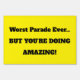 Custom funny marathon cheer sign with bold yellow and black text for high visibility. Features the hilarious message “Worst Parade Ever… BUT YOU’RE DOING AMAZING!” to motivate runners and spark smiles. Easily personalize with your own message—perfect for race day support, marathon spectators, and running events.