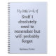 This funny personalized notebook features the text "stuff I absolutely need to remember but will probably forget" with your custom name below on different gender neutral backgrounds! Pick a color and personalize by editing the name in the text box provided! It's the perfect gift for anyone with a sense of humor and a busy mind. Use it for jotting down to-do lists, reminders, important notes, brainstorming ideas, or even daily thoughts!