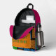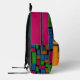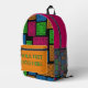 Express your unique style with this customizable geometric backpack. Featuring a vibrant, repeating pattern of abstract shapes in neon colors against a black background, this backpack is a true statement piece. The front pocket offers a perfect space to add your own text, making it a one-of-a-kind accessory for school, travel, or everyday use. Made with durable materials, it combines functionality with a bold, personalized design.