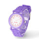 I only have one complaint. I ordered the watch with clear case and strap, and what was sent was white case and strap. I'm going to keep it because 1) it looks very nice in white, and 2) it would take too long to get a replacement made and sent in time for my occasion. Aside from the mix up with the color, the watch does look very good in white. The purple dial is actually sparkly which did not show in the online images. That was a nice surprise. If you like Swatch watches this is very similar to those. It's 33.6mm in diameter, 10.5mm thick, and 40.6mm lug to lug. Stainless steel case back says 3ATM/30m WR, so no swimming or showering or submerging this one. If you like Woodstock, this is a great choice.