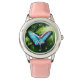 Custom girl's watch with cute blue Morpho butterfly photo. Personalizable wrist watches for children. Unqiue Birthday gift idea for girls. Create one for special daughter, granddaughter, cutest cousin, friend, child, grandchild, little or big sister, mom etc. Beautiful animal image design with numbers and elegant swirly script typography template. Also nice as unique Christmas present for the Holidays. Includes cute pink color band. Add your own name or monogram initial letters. Pretty watch for her. Upload your own picture optionally.