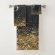 Easily personalize this trendy elegant bath towel set design featuring pretty gold sparkling glitter on a black brushed metallic background.
