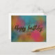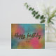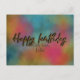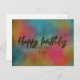 Modern and trendy personalized birthday postcard design featuring the text "Happy birthday" written in faux gold glitter script on a colorful watercolor background.