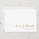 This simply elegant custom gold wedding thank you card template features 'love and thanks' in an elegant script with your first names beneath it in an elegant gold tone called California Gold. We've made the 'love and thanks' entirely lower case, but you might choose to capitalize the 'L' and 'T'. And you might decide on a different format for your names, such as 'Mr. and Mrs....' or your first names and last name, etc. On the back, where we've added placeholder text in the same gold tone. You can change the text color on either or both sides to black if you prefer, or any other color that suits your style. The default shape is rounded corners, but standard sharp corners also work well with this design, so check out that look as well and see which you prefer. You might want to enter your own expression of thanks after deleting our placeholder text on the back, or you might prefer to delete our text and leave that blank so that you can later write your message by hand on each card. Similarly, if you do decide to enter your own message, you might choose to add your names as well, or enter just your message without your names so that you can sign your names by hand on each card after you receive them. You can also of course change the color and font of the text. We set the background as transparent to let the color of the paper simply serve as the base tone on both sides. But if you prefer another look, you can choose a color for the base on either or both sides. Use the intuitive editing tools and your inspiration to make this chic wedding thank you card uniquely yours. And please check our store for a selection of other elegant designs, including this design in black!