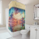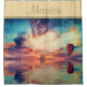 Transform your bathroom with a personalized shower curtain that is also perfect as a gift for the holidays, newlyweds, anniversaries, or birthdays! This gorgeous personalized shower curtain design features a single hot air balloon drifting into a magnificant blue, peach, gold, and orange sunrise with the water below reflecting every lovely color. We've lifted the golden colors from the photograph and created an area for you to personalize. Bordering the scene is a wide band of dark goldish color separating the photograph from the area for your name in the same dark shade as the band. The background for the name and border are a paler version and falls into a sandy color range. This design is courtesy of the public domain collection of www.rawpixel.com.