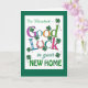 A Good Luck in your New Home greeting card to personalise, with brightly coloured lettering, four-leaf clovers and a horseshoe for luck! A text-based,