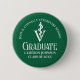 This modern custom green veterinary medicine school graduation party button features the college graduate name in elegant white script for the class of 2025. Customize with your university under the veterinarian medical caduceus for a great graduation gift or DVM name tag.