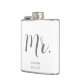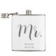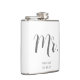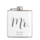 A modern white and gray personalized script custom Mr. Groom name wedding dated flask. Personalize this for a wedding party gift keepsake, and or an engagement gift.