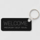 Modern black and white and gray minimalist personalized metal keychain for your guest room, rental house or studio space with custom text and room for a phone number for assistance.