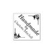This custom stamp features fancy, decorative borders in the top right and bottom corners as the stamp is printed in a diamond shape rather than a square. The center of the stamp features the word "Handmade" printed in an elegant font, followed by a sample name. The name on the stamp can be personalized to include your own name, business or company name, or other custom message or quote.