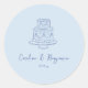This wedding favor sticker has a sweet little line-drawn wedding cake illustration in soft blue at the top, with the couple's names in flowing script and their wedding date just below - simple, romantic, and really pretty on a reception table.
