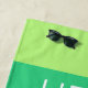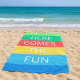 Happy bright colored beach towel with jade and lime green, coral red, vibrant sun yellow, sky and azure blue stripes pattern, and fun HERE COMES THE FUN quote text. Celebrate summer time... beach time, pool time, fun time!
