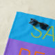 Happy bright colored beach towel with lime green, hot pink, vibrant orange, azure turquoise, purple and dark blue stripes pattern, with a cute seahorse silhouette and fun SAND BEACH SURF OCEAN quote text. Celebrate summer time... beach time, pool time, fun time!