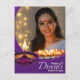Share the joy and light of Diwali with our personalized purple and white greeting postcard featuring a glowing diya, a white mandala, the image of a beautiful woman with a plate full of glowing diyas and "Happy Diwali Festival of Light" written in trendy white font on a purple background. You can easily change the image with your or your loved ones' photo by clicking on the “personalize” button.