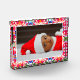 Custom Happy Red Bright Green Christmas Keepsake Photo Block. A jolly geometric pattern frame surrounds the stock photo of a child in a Santa hat. Personalize it by uploading your own photo to celebrate happy Christmas memories. In joyful colors of warm red, bright orange, and pretty pink; with icy Winter blue and pine tree green. Buy as a cheerful gift for grandparents, new parents, to commemorate a baby’s first Christmas, or just family in general who want to remember the good times. Perfect for people who love maximalism and dopamine decor to decorate their cozy home.