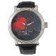 A striking watch featuring a bold red heart on a dark background scattered with small hearts, with the passionate words "I LOVE YOU!" in white script and a customizable name below. The perfect way to carry love on your wrist every day. Ideal for Valentine's Day, anniversaries, engagements, or as a deep romantic surprise. Customize with your special name! High-quality silver case with black leather strap | Quartz movement | Water-resistant
