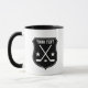 Custom ice hockey sticks and puck logo coffee Mug. Personalized combo color cup for hockey player, sports coach, trainer, team, friends, family, fans, kids etc. Crossed sticks logo with stars. Black and white and other colors. Sporty gift idea for Birthday, Christmas and more. Double sided print. Cool custom mugs for home and office.