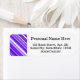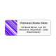 This return address label design features a striped pattern with lines colored various shades of purple or white. It also features a customizable person, family or business name, above a customizable mailing address.