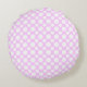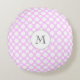 A custom initial with a vintage block letter on a round pillow with white polka dots on pink.