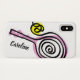 Custom iPhone 10 case design for tennis players. Personalized phone cover with artistic design of pink tennis racket and yellow tennis ball. Add your own name, quote or monogram letters. Sports art drawing of tennis racquet. Customizable Birthday presents for sporty men women and kids. Elegant gift idea for player, fan and coach. Stylish brush script typography. Create one for mom, sister, daughter, friend, team mate, doubles partner, trainer, teacher, grandma, cousin, girl etc. Iphone X accessories for her.