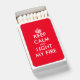 Custom keep calm and carry on meme matchboxes. Modern typography template with crown. Add your own funny text. Great for fun wedding party, corporate business event, favor gifts and more. Red and white example.