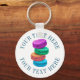 Custom keychain with French macaron cookie drawing. Cute key chain with personalized text and colorful illustration. Fun Birthday gift idea for friends, family, coworker, colleague, kids etc. Pink, green, orange and blue colors. Pasty sweets in different flavors with elegant text template.