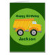 A cool yellow dump truck on a cute custom green card for a child who likes construction vehicles and cars. Personalize this happy birthday greeting card with your toddler or kids name.