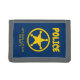 Custom kid's wallet with yellow police badge logo and name. Personalized Birthday gift idea for children. Fun yellow police star design for boys or girls who love playing cops and robbers. Law enforcement theme accessories. Cute gift for son, grandson, nephew, play friends etc. Arrest, put a criminal in jail, guard and patrol duty and other games.