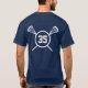 Customizable lacrosse player number shirt. Crossed lacrosse sticks and circle with your personalized number inside. Custom lacrosse designs. White design on dark background.