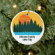 Beautiful family lake vacation Christmas ornament featuring the pretty blue waters under the forest of trees and cool orange sunset. Cute camping trip keepsake souvenir for your nature outing or wilderness group.