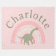 A custom little girl's fleece blanket with a rainbow and a cute dinosaur design on a soft pink background. Personalize it with her name to make it unique.