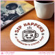 Promote your business with these customizable coasters that feature a charming illustration of a smiling coffee cup, bold typography that says, “Sip Happens,” plus a customizable text placeholder where you can add your shop name. Modify the design by adding your own logo (or use this logo as it is) and your business name to create custom promotional and branding products. Perfect for coffee shop, cafe, or coffee bar owners.