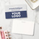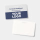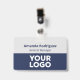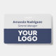 Make your business look professional with custom name badges featuring your company logo, employee name, and job title. Customize it in the sidebar. The staff person's name appears at the top in bold navy blue text with the job title or custom text below it in a navy italic font on a grey background. The bottom half of the badge features your logo on a dark blue background. This design works best with white or light colored logos.